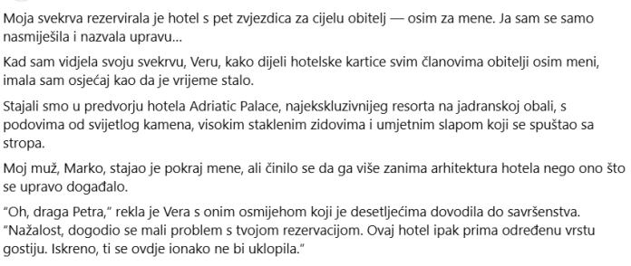 Olivia je osjetila najmanju promjenu u zraku čim su te riječi napustile govornika. „Jeste li ovdje na sastanku za praćenje projekta?“ Na djelić sekunde, elegantno predvorje, uglačani mramorni podovi, umjetni vodopad – sve je to kao da je nestalo u pozadini. „Da“, odgovori Olivia mirno, glasom stabilnim i jasnim. „Upravo sam stigla. Ali čini se da postoji mali problem s mojom prijavom.“ Nastala je kratka pauza na liniji. „Razumijem“, rekao je glas, sada oštriji, pažljiviji. „Molim vas, ostanite gdje jeste. Bit ću tamo za manje od dvije minute.“ Olivia se lagano nasmiješila. „Hvala ti, Daniele.“ Završila je poziv. Ramonine su se oči suzile taman toliko da odaju napetost koju je toliko trudila sakriti. „Koga si točno upravo nazvao?“ upitala je, ton joj je i dalje bio sladak, ali sada je imao oštrinu. Olivia je vratila mobitel u torbu. „Uprava“, rekla je jednostavno. Tomás je konačno skrenuo pozornost sa stropa. „Što se događa?“ upitao je, lagano se namrštivši. „Ništa“, odgovori Olivia blago. „Samo ispravljam nesporazum.“ Ali iznutra je osjećala kako joj se otkucaji srca stabilni – ne ubrzani, ne tjeskobni. Kontrolirani. Jer ovaj trenutak… upravo ovaj trenutak… zamišljala ga je i prije. — Četiri mjeseca ranije, kada je Ramona prvi put najavila putovanje, Olivia je primijetila nešto čudno. Ne samo izbjegavanje. Ne samo nejasni odgovori. Ali sam hotel. Odmaralište Coral B. To ime joj je nešto urezalo u sjećanje. Isprva ga nije mogla smjestiti. Ali te noći, nakon što je Tomás zaspao, otvorila je laptop i potražila ga. A kad se početna stranica učitala… ukočila se. Jer je to odmah prepoznala. Ne kao gost. Ali kao projekt. Prije tri godine, Olivia je bila dio povjerljive razvojne inicijative – potpunog restrukturiranja operativnih sustava Coral B. Ne samo IT-a, već i analitike iskustva gostiju, upravljanja klijentima na visokoj razini i diskretnih VIP protokola. Nije rekla nikome u obitelji. Ne Tomás. Ne Ramona. Jer svaki put kad bi u prošlosti pokušala podijeliti i najmanji uspjeh, bio bi odbačen, umanjivan ili iskrivljen u nešto drugo. Zato je prestala dijeliti. I tiho… rasla je. Tada nije samo radila na projektu. Vodila je završnu fazu. A Daniel Herrera – generalni direktor Coral B-a – osobno joj je zahvalio što je transformirala interni sustav odmarališta u jedan od najnaprednijih u regiji. Ostali su u kontaktu. Ne često. Ali dosta. Dovoljno da se sjeti njezina imena. — Natrag u sadašnjosti, vrata dizala su se otvorila uz tiho zvono. Visok muškarac u odijelu krojenom izašao je, odlučno pregledavajući predvorje. Njegov pogled je odmah pao na Oliviju. I njegov izraz lica se promijenio. Toplina. Prepoznavanje. „Olivia!“ Bez oklijevanja je krenuo prema njoj. „Daniel“, rekla je, uljudno se osmjehujući. Pružio je ruku, ali umjesto formalnog stiska, njegov je ton izražavao iskreno poštovanje.