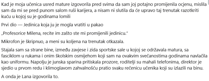 „Kad sam vas prozvala na bini, mislila sam da ćete me zamrziti.“ „Jesam na tri sekunde“, priznala sam. Prvi put se nasmijala. Onako stvarno. A onda je opet spustila pogled. „Znam da ono što ste uradili nije bilo ispravno.“ „Nije.“ „Ali ni ono što su oni radili meni nije bilo ispravno, pa je svima to bilo lakše gledati.“ Sagnula sam glavu. „Da.“ Iz torbe je tada izvadila tanku svesku. Moju staru bilježnicu, prepoznavala sam korice jer sam takve kupovala svim generacijama kad bi nekome trebalo više prostora za pisanje. Gurla ju je prema meni. „Počela sam opet.“ Otvorila sam je. Na prvoj stranici stajalo je: „Nisam spašena ocjenom. Spašena sam time što me je neko jednom pogledao i nije odustao kad je vidio.” Tad sam ponovo zaplakala, i ovog puta nisam se stidjela. Do jeseni je Vesna dobila krivičnu prijavu zbog pokušaja prisile, finansijskih zloupotreba i nasilja u porodici. Mladen je izgubio starateljstvo. Majčin stan vraćen je u Lanino ime uz privremenu zaštitu do punoljetstva. Škola je prema meni izrekla službenu opomenu i obaveznu superviziju, ali ne otkaz. Direktorica je na nastavničkom vijeću rekla ono što nisam očekivala da ću ikad čuti od nekoga na toj funkciji: „Pravila postoje da štite djecu, ne da sakriju naš kukavičluk pred njihovom patnjom.“ Niko nije aplaudirao. Ali poslije su mi tri mlađe kolegice prišle u zbornici i jedna od njih je tiho rekla: „Hvala vam što niste pustili da je pojedu.“ Kad je stigla nova generacija maturanata iduće godine, ja sam opet stajala iza zavjese, opet s fasciklom u rukama, opet s onim školskim osmijehom koji više nije bio maska nego nešto mirnije. Telefon mi je zavibrirao tik prije početka. Lana. Poslala je fotografiju iz studentskog doma. Sjedila je na krevetu, oko nje knjige, skripte i šalica čaja. Ispod slike napisala je samo: „Danas sam položila prvi kolokvij iz prava. Dvojka više nije dovoljna. Sad idem na peticu.” Naslonila sam se na zid i zatvorila oči na sekundu. Matura na kojoj me slomila nije bila kraj. Bila je trenutak kad se lom konačno vidio svima. Ja jesam potajno promijenila ocjenu svojoj učenici. I da mogu vratiti vrijeme, opet bih izabrala dijete prije tišine, samo bih ovog puta mnogo ranije razbila vrata iza kojih je šutjela. Jer ono što me tada skoro uništilo nije bilo njeno prozivanje pred punom salom. Uništila me spoznaja koliko dugo odrasli mogu uredno sjediti na svojim mjestima dok jedno dijete propada. A ono što me poslije vratilo nije bila oprost, ni karijera, ni pravilo koje me ipak nije slomilo. Vratilo me to što je djevojčica, koju su godinama pokušavali ušutkati, na kraju uzela mikrofon, rekla istinu i iz te istine izašla živa.