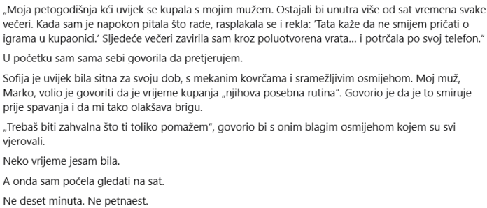 Samo sam ponovila svoju adresu i zamolila ih da odmah dođu. Mark me isprva nije čuo. Nastavio je razgovarati sa Sophie s uvježbanim strpljenjem, poput čovjeka koji vjeruje da svaka njegova gesta zaslužuje povjerenje, čak i kad već miriše na laž. Bila je sklupčana u kadi, koljena privučena uz prsa.