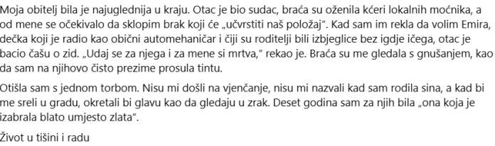 Moja obitelj bila je najuglednija u kraju. Otac je bio sudac, braća su oženila kćeri lokalnih moćnika, a od mene se očekivalo da sklopim brak koji će „učvrstiti naš položaj“. Kad sam im rekla da volim Emira, dečka koji je radio kao obični automehaničar i čiji su roditelji bili izbjeglice bez igdje ičega, otac je bacio čašu o zid. „Udaj se za njega i za mene si mrtva,“ rekao je. Braća su me gledala s gnušanjem, kao da sam na njihovo čisto prezime prosula tintu. Otišla sam s jednom torbom. Nisu mi došli na vjenčanje, nisu mi nazvali kad sam rodila sina, a kad bi me sreli u gradu, okretali bi glavu kao da gledaju u zrak. Deset godina sam za njih bila „ona koja je izabrala blato umjesto zlata“. Život u tišini i radu