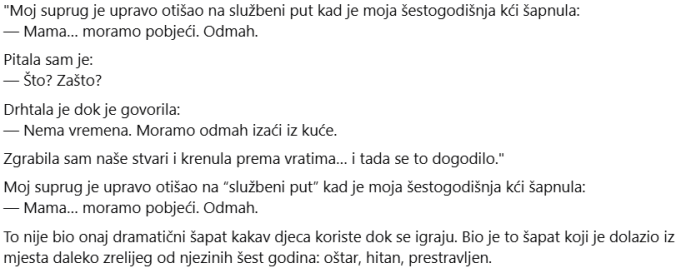 „Ne, ljubavi moja“, rekla sam. Živa sam jer si mi ti tako rekla. Oči su joj se napunile suzama. „Bojao sam se da mi nećeš vjerovati. Zagrlio sam je najčvršće što sam mogao. „I ja sam se bojao. Ali vjerovao sam ti.“ Stajala je mirno na trenutak, a zatim me obgrlila oko vrata. Ponekad, noću, još se sjećam klika iza vrata. Nevidljiva nit. Miris plina ispod arome kave. I razumijem da su naši životi bili razdvojeni upravo u tom trenutku: kad sam pružila ruku prema izlazu, on se pripremio postati naš kraj. Ali to nije bio naš kraj. Jer mi je moja šestogodišnja kći, sa svojim drhtavim glasom i prevelikim strahom za svoju dob, dala jedinu priliku koja nam je bila potrebna. I poslušala sam je.