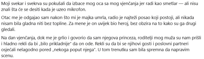 Na kraju se okrenuo prema meni. Rekao je da sam ja dokaz da posao ne definiše čovjeka, već karakter. Da je njegov najveći uspjeh to što sam odrasla u ljubavi i poštovanju. Tada su mi suze same krenule.