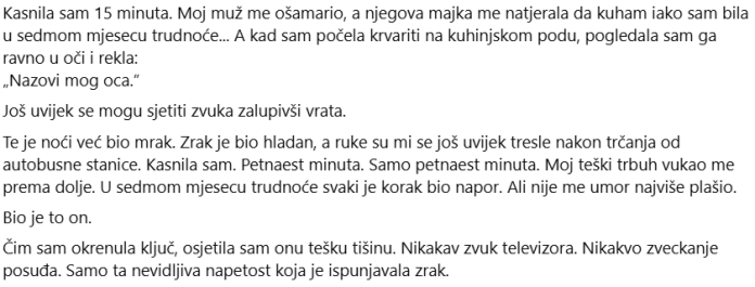 Mjesecima gotovo uopće nisam pričala o tome. Izblijedila sam. Prihvaćala sam njihova pravila, njihove primjedbe, njihova poniženja. Željela sam da moj brak funkcionira. Željela sam biti „dobra supruga“. I prije svega… nisam htio stvoriti sukob između svoje i njihove obitelji. Zato sam šutio. Ali te večeri… ova tišina je bila prekinuta. „Blefiraš“, rekao je moj muž, ali glas mu je lagano drhtao. Nisam odgovorio/la. Jednostavno sam se naslonila na namještaj kako se ne bih potpuno srušila. Snažniji trud me izmamio jauku. Ovaj put, čak ni on to nije mogao ignorirati. „Stvarno krvari“, šapnuo je, više za sebe nego za nas. Njegova majka je prišla, čučnuvši ispred mene s ljutitim izrazom lica, ali ruke su joj oklijevale. „To sigurno nije ništa. Događa se…“ „Ne…“, šapnuo sam. Nije to „ništa“. Pogledao sam je ravno u oči. „A ako se išta dogodi mom djetetu—“ Morat ćeš s tim živjeti. Usne su joj se stisnule. Po prvi put nije imala što odgovoriti. Moj muž je napravio korak unatrag. Zatim još jedan. Izvadio je telefon. „Ja… ja ću pozvati hitnu pomoć.“ “Ne. Moj glas je bio glasniji nego što sam mislio/mislila. Smrznuo se. „Prvo… moj otac.“ Još jedna tišina. Zatim je, bez ijedne riječi više, okrenuo broj. Ne znam koliko je dugo trajalo. Možda nekoliko sekundi. Možda cijela vječnost. Ali kad je prislonio telefon na uho, vidio sam kako mu se ruka trese. “Zdravo…?” Njegov glas više nije bio dominantan. Više ništa agresivno. Samo… strah. Jedva je imao vremena reći nekoliko riječi prije nego što se ton s druge strane promijenio. Nisam mogao jasno čuti… ali sam prepoznao taj glas. Smiriti. Hladno. Autoritaran.