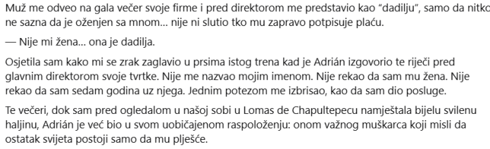 Kad sam bila sama, gledala sam kroz prozor u grad. Razmišljala sam o ženi kakva sam bila godinama: onoj koja je snižavala glas kako nikoga ne bi učinila neugodnim, onoj koja se smanjivala kako bi muškarac pored nje izgledao veći, onoj koja je skrivala svoju inteligenciju, svoj novac i svoju moć jer je vjerovala da voljeti znači žrtvovati sebe. Pogriješio sam. Ljubav ne traži od tebe da nestaneš. Ne zahtijeva da se umanjiš kako bi se netko drugi osjećao superiorno. Prava ljubav se ne srami tebe u javnosti niti te omalovažava pred bilo kim. A ako netko zna kako te voljeti samo kada vjeruje da je iznad tebe, onda te ne voli: iskorištava te. Tog poslijepodneva, prije nego što sam otišla, moja asistentica je na moj stol stavila fotografiju koju su pronašli u Adrianovom starom uredu. Bila je s našeg vjenčanja. Smiješila sam se, odjevena u jednostavnu haljinu. Gledao me kao da me stvarno vidi. Zurio sam u nju nekoliko sekundi. Nisam plakao. Nisam ga zadržao. Nisam ga pretvorio u relikviju. Stavio sam ga u kantu za recikliranje i nastavio hodati. Jer žena koja je te noći predstavljena kao “dadilja” više nije postojala. Na njezino mjesto bila je Mariana Villaseñor, vlasnica, direktorica, kompletna žena. I napokon sam shvatio da kad netko ne može podnijeti tvoju svjetlinu, ne moraš prigušiti svjetlo da bi se osjećao ugodno. Moraš se više zagrijavati.