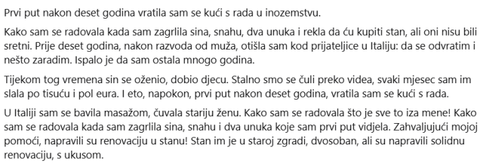 Kako sam se radovala kada sam zagrlila sina, snahu, dva unuka i rekla da ću kupiti stan, ali oni nisu bili sretni. Prije deset godina, nakon razvoda od muža, otišla sam kod prijateljice u Italiju: da se odvratim i nešto zaradim. Ispalo je da sam ostala mnogo godina. Tijekom tog vremena sin se oženio, dobio djecu. Stalno smo se čuli preko videa, svaki mjesec sam im slala po tisuću i pol eura. I eto, napokon, prvi put nakon deset godina, vratila sam se kući s rada.