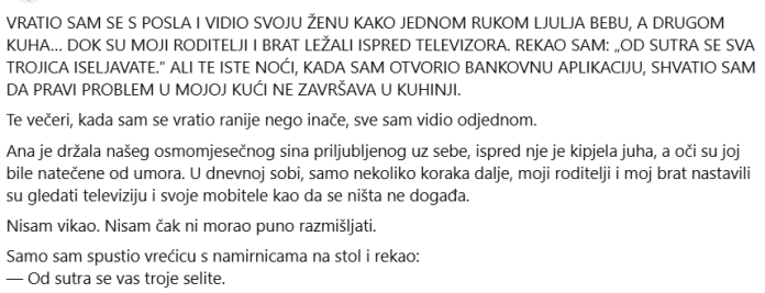 — U redu. Uspjeli smo. Ali ne da te uništimo. Dovraga, Ale, to je bio samo novac. Osjetio sam nešto vrlo čudno u prsima. Umor toliko dubok da se gotovo činio kao mir. — Ne. Nije bio samo novac. Bio je to moj dom. Moj sin. Moja žena. Moj život. Bio je to mir s kojim sam te pustio ovamo, misleći da si, koliko god bio dosadan ili nametljiv, i dalje moja obitelj. A ti si to pretvorio u priliku. Vrata hodnika su se otvorila. Ana je bila tamo. Nosila je dijete u naručju, kosa joj je bila na brzinu začešljana unatrag, oči su joj bile natečene od sna. Čula je dovoljno. Znala sam to po načinu na koji je čvrsto držala našeg sina na grudima. Nisam se bojala za nju. Bojala sam se da ću ponovno postati izgovor ili meta. Bez razmišljanja sam krenuo prema njoj i stavio joj ruku na leđa. „Vrati se u sobu“, šapnula sam mu. On je to porekao. — Ne. Ne ovaj put. To me je na čudan način slomilo iznutra. Jer Ana nikada nije rekla “ovaj put”. Nikada nije povlačila granice. Ipak, bila je tu, drhteća, ali mirna. Moja majka ju je pogledala sa mješavinom prezira i hinjene tuge. — Pogledaj što si učinio mom sinu. Ana ga je gledala u oči. Nije povisila glas. Nije trebala. — Ne. Pogledaj što si učinio. Moj brat je frknuo. —Sada se ispostavilo da svetac govori. Okrenula sam glavu prema njemu tako brzo da je beba poskočila. — Ne razgovaraš s njim. — I što ćeš učiniti? Nisam uzvratio viknuvši. Iz ladice komode izvadio sam drugi mobitel – onaj stari, onaj kojim sam primao e-poštu – i nazvao. Melodija zvona bila je glasnija nego inače u tišini dnevne sobe. Otac me pogledao nečim što je konačno nalikovalo strahu. — Koga zoveš? — Civilnoj gardi — odgovorio sam, ne skidajući pogled s brata. Moja majka je ogorčeno uzdahnula. – Lud si! — Ne. Već sam pokušao biti razuman s tobom. Nije uspjelo. Moj otac je napravio korak prema meni. — Alejandro, spusti slušalicu. -Ne. — To će se riješiti unutar obitelji. Pustio sam smijeh. — Pokušao si. U obitelji si me opljačkao. Operater se javio nakon drugog zvona. Objasnio sam najosnovnije: neovlašteni pristup bankovnim računima, snimke, mogući pokušaj prijevare s dokumentima, potrebu da napuste moj dom. Nisam pretjerivao. Nisam uljepšavao. Nisam podizao glas. I upravo zbog toga, situacija je postala nepodnošljivo stvarna. Kad sam spustio slušalicu, nitko nije progovorio nekoliko sekundi. Beba se promeškoljila u Aninom naručju, nesvjesna svega osim napetosti u majčinom tijelu. Uzela sam je i naslonila na svoje rame kako bi imala slobodne ruke. Pogledala me, iznenađeno, gotovo dirnuto, kao da je tako mala gesta trebala godinama da se dogodi. Možda i jest. Moja majka je prva povratila govor. — Radiš nam ovo zbog nečega trivijalnog. Zbog nekoliko poteza. Zbog četiri nesporazuma. Ana je ispustila nešto vrlo slično smijehu, ali bez radosti. — Ne. Izbacuje te zbog svega što ti je predugo dopuštao da radiš. Pogledao sam je krajičkom oka. U tome je bilo istine. Puno. Jer da sam zaista postavila granice tjedan dana, ili mjesec dana, ili kada sam vidjela brata kako ostavlja šalice na stolu poput konobarice, ili kada ga je majka ispravljala dok je dojio preda mnom, ili kada je moj otac zahtijevao tišinu jer ga “dijete čini nervoznim”, možda ne bi došlo do banke, kodova ili stana. Zlostavljanje rijetko počinje na veliko. Počinje tamo gdje je dopušteno. „Idi gore i pokupi svoje stvari“, rekao sam. „Imaš jedan sat.“ Moj brat je raširio ruke. — Neću se pomaknuti. —Drugi će te pokrenuti. Otac me jako dugo promatrao. Mislim da je odlučivao hoće li igrati na kartu drame, na emocionalnu kartu, na kartu “tvoja majka nije dobro”, na kartu “ubit ćeš me od brige”. Na kraju je odabrao stariju, prljaviju kartu: kartu krivnje. — Nakon svega što smo učinili za tebe. To mi je stvarno uzavrelo krv. —Što si učinio za mene? Odgojio me? To je bila tvoja dužnost. Podsjeti me na to svaki put kad ne poslušam? To nije ljubav. To je emocionalno računovodstvo. I to je to. Ne znam jeste li me ikada čuli da ovako govorim. Ni ja sebe nisam čuo da ovako govorim. Ali nije bilo povratka. Nevoljko su se popeli gore. Moja majka je tiho plakala. Moj otac je bio ukočen. Moj brat je psovao u sebi. Kad su nestali uz stepenice, Ana je konačno sjela na rub sofe i pokrila lice rukama. Beba je još uvijek bila u mom naručju, pripijena uz moju majicu. — Oprostite mi — rekao sam. To nije bila dovoljna rečenica. Ni blizu. Ali ona je bila jedina iskrena. Polako je spustila ruke. —Nisam znao kako da ti kažem da ovo više nije normalno, a da ne ispadnem negativac. Osjetio sam grubu knedlu u grlu. — Nisi mi trebao reći. Trebao sam to sam vidjeti. Ana je pustila suzu. Samo jednu. Odmah ju je obrisala. —Viđala si ga malo. Ali uvijek je postojao izgovor. Da. Uvijek je bio jedan. Došli su izvana. Da bi otišli. Da je moja majka bila takva, ali duboko u sebi je htjela pomoći. Da je mom ocu uvijek bilo hladno. Taj Sergio je bio izgubljen i trebao mu je poticaj. Da je Ana bila jaka. Da se ništa neće dogoditi još jedan tjedan. Da se oko toga nije isplatilo raspravljati. I dok sam se izmišljao, žena koju sam volio smanjivala se u mojoj vlastitoj kući. Čule su se ladice gore. Koferi. Vrata su se zalupila. Mislio sam da je najgore već jasno. Da će jutro biti samo napeto, bolno, možda ponižavajuće, ali predvidljivo. Pogriješio/la sam. Dok je Ana dojila bebu na kauču, iskoristila sam priliku da ponovno provjerim e-poštu na svom starom telefonu i bankovne izvode na tabletu. Htjela sam sve pripremiti prije dolaska Civilne garde. Sortirati datume, iznose, zabilježiti. Ako sam išta naučila radeći s građevinskim projektima i ugovorima, to je da ljudi mogu lagati bolje od svog pamćenja, ali gore od pisanog dokumenta. Tako sam pronašao pokret koji nisam vidio prethodne noći. Nije bio transfer. Bila je to autorizacija pristupa. Dječji štedni račun. Sekund