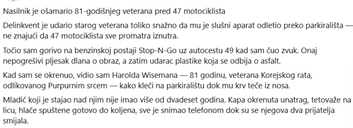 Jedan od njih se osvrnuo oko sebe. Četrdeset i sedam motociklista. Krvavi veteran. Tri dječaka s telefonima. — Što se ovdje dogodilo? Pružio sam mu telefon s videom. — Sve je tamo. Oficir ga je pogledao. Zatim je pogledao dječaka. — Stavi ruke iza leđa. Kad su lisice škljocnule, parkiralište je utihnulo. Prije nego što su ga odveli, dječak se osvrnuo oko sebe. Četrdeset i sedam muškaraca ga je promatralo. I stariji ratni veteran koji stoji. Tog poslijepodneva video je postao viralan. Ali ne s naslovom koji je zamišljao. Naslov koji se pojavio na internetu bio je: **„81-godišnjeg veterana Korejskog rata štitilo je 47 bajkera nakon što je napadnut.“** I po cijelom gradu, dugo vremena, nitko nije zaboravio nešto vrlo jednostavno: Postoje greške. I postoje greške koje radiš **pred krivim ljudima.**