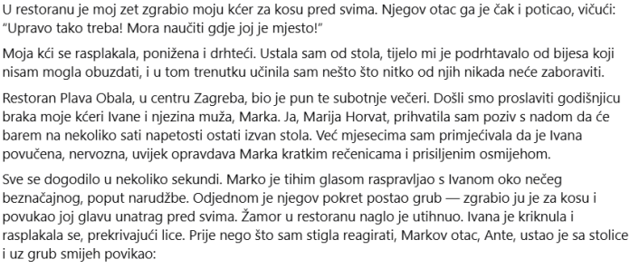 Konobar je konačno reagirao. — Gospodine… molim vas… sjednite… Ali bilo je prekasno. Vrlo kasno. — Vrata restorana su se otvorila. Ušla su dva oficira. Zatim drugi. Atmosfera se potpuno promijenila. Autoritet. Redoslijed. Prisutnost. — Tko je zvao? Podigao sam ruku. -Ja. Jedan od oficira se približio. -Što se dogodilo? Pokazao sam na Claru. — Moja kćer je napadnuta. Agent je pogledao Claru. -Dama? Klara je oklijevala. Cijelo mu je tijelo drhtalo. Daniel ju je pogledao. Taj pogled. Isto kao i uvijek. Onaj koji ju je natjerao da bude tiha. Onaj koji ju je natjerao da laže. „Bio je… bio je to nesporazum…“ započeo je. A onda… Učinio/la sam nešto drugo. Nešto što je promijenilo sve. — — Nemoj lagati. Moj glas nije bio glasan. Ali da, čvrsto. Klara me pogledala. Zbunjen/a. Prestrašen. „Ne moraš ga štititi“, nastavio sam. „Više ne.“ Daniel je eksplodirao. – Tiho budi! Ali jedan od policajaca je intervenirao. — Gospodine, odmaknite se. Klara je počela ubrzano disati. -Majka… Približio sam se. Prihvatio sam njegovu ruku. —Vidio sam te. Tišina. — Svi smo te vidjeli. Pogledao je oko sebe. Po prvi put. Stvarno. I razumio je. Nije bila sama. Više ne. — Agent je ponovno progovorio.