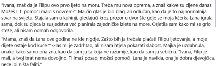 “Mama, znaš da Lana ove godine ne ide nigdje. Zašto bih ja trebala plaćati Filipu ljetovanje, a moje dijete ostaje kod kuće?” Glas mi je zadrhtao, ali nisam htjela pokazati slabost. Majka je uzdahnula, onako kako samo ona zna, kao da sam ja ta koja ne razumije, kao da sam ja sebična. “Ivana, Filip je mali, a tvoj brat nema dovoljno. Ti imaš posao, možeš pomoći. Lana je navikla, ona je dobra djevojčica, neće joj ništa faliti.”