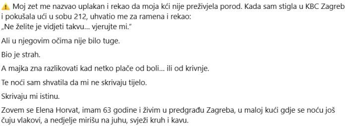 Ali nije bila sama. Trebala mi je jedva sekunda da to shvatim, a ipak mi je ta sekunda promijenila život. Mariana je bila živa, da. Živa, blijeda, drhtava, kosa joj je bila slijepljena za čelo od znoja, haljina joj je bila otvorena preko zavijenog trbuha. Ali pokraj nje, klečeći pred njom, bila je žena koju nisam prepoznala. Nije bila medicinska sestra. Nije nosila uniformu. Bila je odjevena u uličnu odjeću: svijetle hlače, bež bluzu i diskretne naušnice koje su se sukobljavale s mirisom krvi i kaosom sobe. U ruci je držala praznu špricu, a na podu, pokraj cipela, ležala je tamnoplava torba za pelene. Kad me je vidio kako ulazim, naglo je ustao. A Mariana, prepoznavši me, podigla je lice s naporom koji me rastrgao. „Mama…“ ponovila je, ali ovaj put joj je glas bio jasniji, iako isprekidan. „Nemoj dopustiti da ga odvedu.“ Osjećao sam kao da se nešto u meni lomi. Nisam pitao tko. Nisam trebao/trebala. Beba. Moj unuk. Liječnik je ušao iza mene. Medicinska sestra također. Ivan je pokušao gurnuti, ali sam se okrenula s bijesom za koji čak ni ja nisam znala odakle dolazi. — Ni koraka više — rekao sam mu. I prvi put otkad sam stigao, popustio je. Nepoznata žena podigla je obje ruke, kao da je htjela izgledati bezopasno. — Gospođo, krivo shvaćate— „Začepi“, viknuo sam na njega. „Ili ću ti ovdje iščupati jezik.“ Ne znam je li to bio moj glas ili moj pomiješan s glasom svih majki na svijetu kad namirišu opasnost, ali žena je ostala nepomična. Prišao sam Mariani i kleknuo pokraj nje. Dodirnuo sam joj lice. Bilo je vruće. Njezine oči, ogromne, prepune boli i straha, tražile su moje kao kad sam se kao dijete budio iz noćne more. „Evo me, ljubavi moja“, rekla sam, iako mi je cijelo tijelo drhtalo. „Stigla sam.“ Zgrabila me za zglob snagom koja se u tom stanju nije činila mogućom. „Žele mu ga dati“, šapnula je. „Mama, žele mi ga oduzeti.“ Pogledao sam liječnika. Djevojka je posramljeno spustila pogled. To mi je bilo dovoljno da shvatim da nije luda. Nije to bio delirij. Nije to bila postporođajna zbunjenost. Ono što je moja kći govorila stvarno se događalo. „Odmah mi objasni što se događa“, naredio sam. Žena u bež bluzi htjela je prva progovoriti. —Nemate pravo ispitivati ikoga bez— Medicinska sestra, koja dotad nije otvorila usta, ispustila je nešto poput suhog smijeha. — Također nemate pravo biti ovdje s lažnom naredbom. Soba je postala ledena. Pogledao sam medicinsku sestru. Bila je tamnokosa, niska, s dubokim podočnjacima i identifikacijskom pločicom na kojoj je pisalo R. Cortés. Ova žena, koja je do prije nekoliko minuta izgledala kao još jedna sjena u bolnici, sada je imala stisnutu čeljust i pogled nekoga tko je umoran od gutanja tuđeg smeća. Ivan je problijedio na vratima. „Nemoj previše pričati“, rekao je kroz stisnute zube. Doktor se okrenuo prema njemu. — Ne. Dosta je. Ovo neće stići tako daleko. „Onda nisi trebao otvarati usta“, odgovorio je. Mariana je počela tiho plakati, licem okrenuta prema mom šalu, kao da je još uvijek bolesno dijete skriveno u meni. —Mama, odveli su ga u vrtić… ali ga ne žele prijaviti kod mene… kažu da je bilo komplikacija… da bih se trebala odmoriti… da ću kasnije potpisati… Nisam ništa potpisala… Kunem se… Poljubio sam je u čelo. – Vjerujem ti. Rekao sam to glasno i jasno. Za nju. Za mene. Za sve. Jer riječ koja je ženi u kutu najpotrebnija je: Vjerujem ti. Nepoznata žena se lagano uspravila. —Gospođo, ja sam vanjski socijalni radnik. Ovdje sam da pomognem u teškoj situaciji— „Kako se zove?“ prekinuo sam je. Oklijevao je. Loš znak. —Gabriela Núñez, odvjetnica „Laže“, rekla je medicinska sestra Cortés. Nije povisio glas. Nije bilo potrebe. — Sinoć su mi je predstavili kao „obiteljsku odvjetnicu“. Pogledao sam Ivana. Tada sam to jasno vidio. Više nego na početku. Više nego u hodniku. Više nego kad mi je rekao da mu vjerujem. Nije mu se na licu ispisivala samo krivnja. Bila je to panika čovjeka zarobljenog između laži koja se više ne može održati i još gore koja još nije sasvim izašla na vidjelo. „Koja obitelj?“ upitao sam. Doktor je konačno progovorio. —Obitelj gospodina Ivana. Mariana se ukočila u mom naručju. „Ne“, rekla je. „Nemoj ga slušati. Njegova majka… njegova majka je rekla da dječak ne može ostati sa mnom.“ Svijet se opet savio.